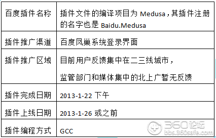 360安全中心发现,百度对其插件注册名称为Baidu.Medusa(美杜莎,希腊神话中丑陋的毒蛇女妖)。一旦用户电脑安装该插件,百度能够轻易判断出用户正在使用哪款浏览器上网,再专门针对360浏览器进行不兼容提示。