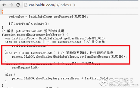 网页脚本判断如果返回的状态码是-3,那么就调用控件的getSendbackMessage接口,目的是获得百度服务端返回的一段文字,并弹出对话框提示用户更换其他浏览器。