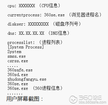 据工程师分析,百度“美杜莎偷拍插件”会采集用户系统信息,包括电脑的CPU信息、磁盘序列号、网络地址和网卡信息、当前所有进程列表和浏览器进程名,并在用户登录百度凤巢时对电脑屏幕截图,再将这些信息一并上传到百度服务器上,以此识别和封杀360浏览器,甚至利用这些信息向用户推送“精准广告”。