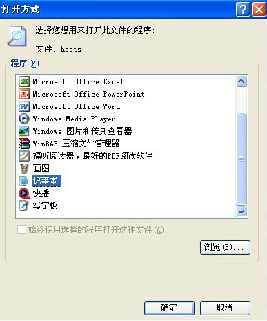 2、找到hosts文件,用记事本方式打开它,点击确定。
